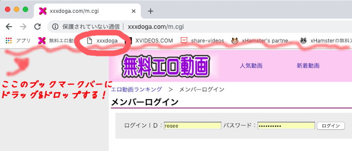 上記の 【ブックマークレット:xxxdoga】 の「xxxdoga」をクリックしたまま ブックマークバーに ドラッグ&ドロップするだけでオケw